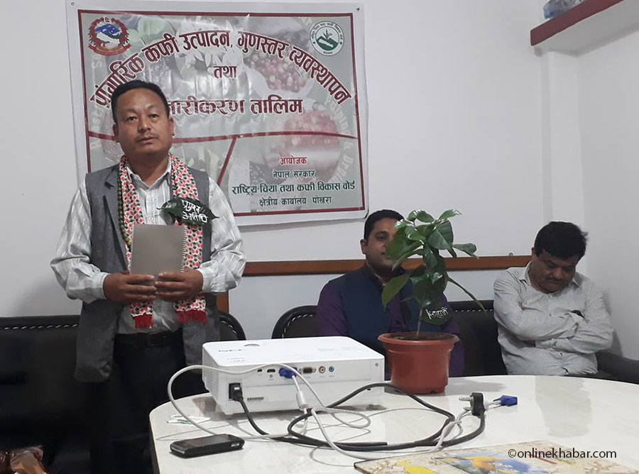 १३ असोज, पोखरा । कफी उत्पादनमा बृद्धी गर्दै त्यसको बजारीकरणमा सघाउ पुर्याउने उद्देश्यले पोखरामा कफी सम्बन्धी तीनदिने तालिम शुरु भएको छ । राष्ट्रिय चिया तथा कफी विकास वोर्ड क्षेत्रीय कार्यालय पोखराको आयोजनामा ‘प्रांगरिक कफी उत्पादन, गुणस्तर व्यवस्थापन तथा बजारीकरण’ तालिम शुरु भएको हो ।तालिमको गण्डकी प्रदेशका कृषि, भूमि व्यवस्था तथा सहकारी मन्त्री लेखबहादुर थापाले कफीको विरुवामा पानी हालेर उद्घाटन गरे । उद्घाटन कार्यक्रममा बोल्दै मन्त्री थापाले झोलामा फर्म बोकेर अनुदान खानेहरुलाई बेलैमा चिन्नुपर्ने बताए ।